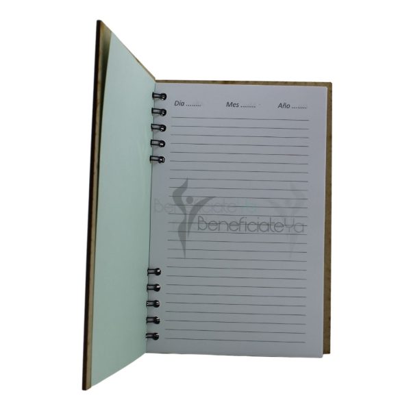 Utilizar un cuaderno de pasta firme en MDF, con un sistema argollado doble grueso en base de aluminio, generando un dobles fácil y resistente, este le brinda comodidad para niños y adultos durante su uso, su diseño en corte laser permite lograr diferentes acabados y diseños. En su interior se encuentra marcado con el motivo en cada hoja.